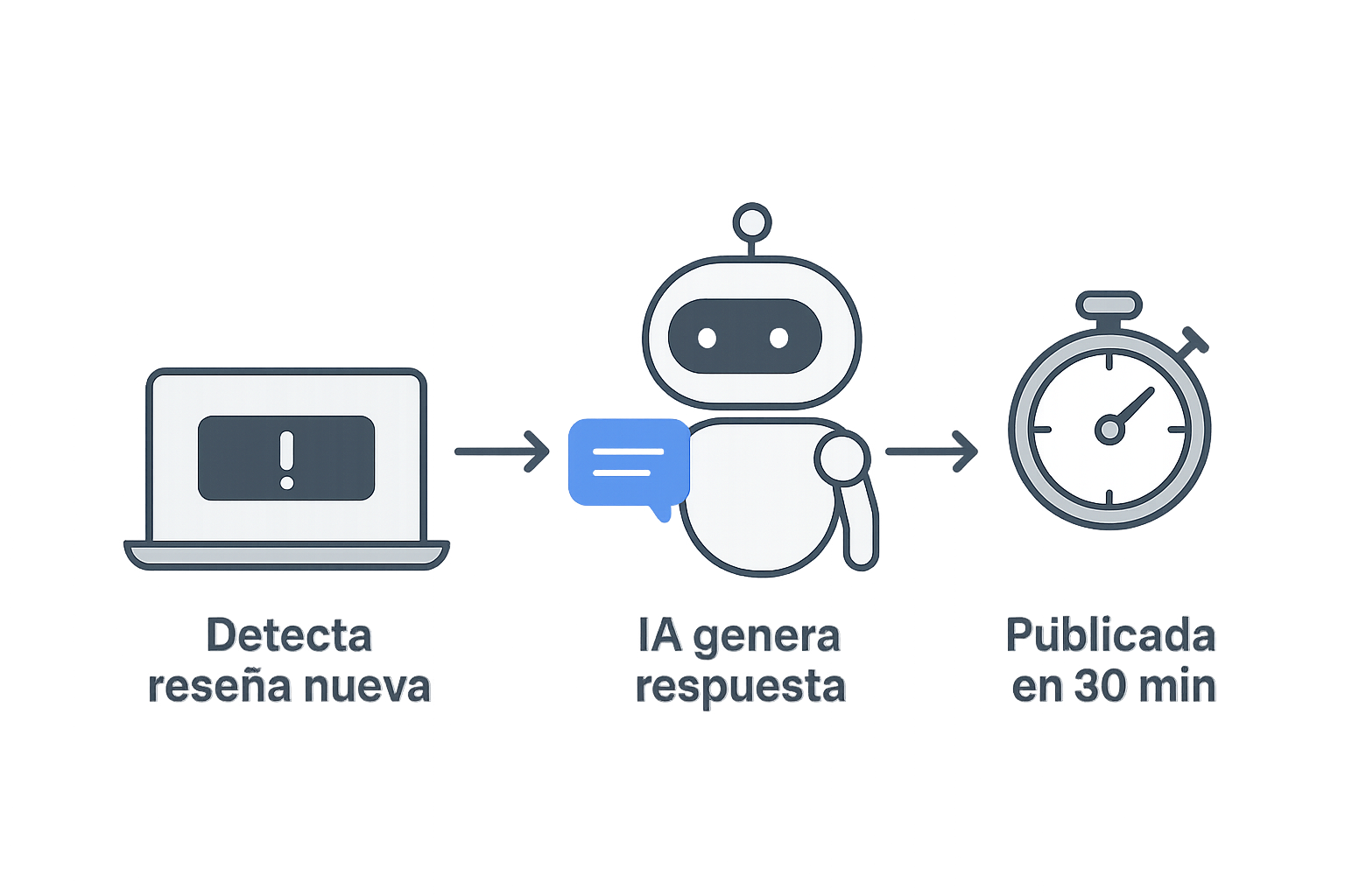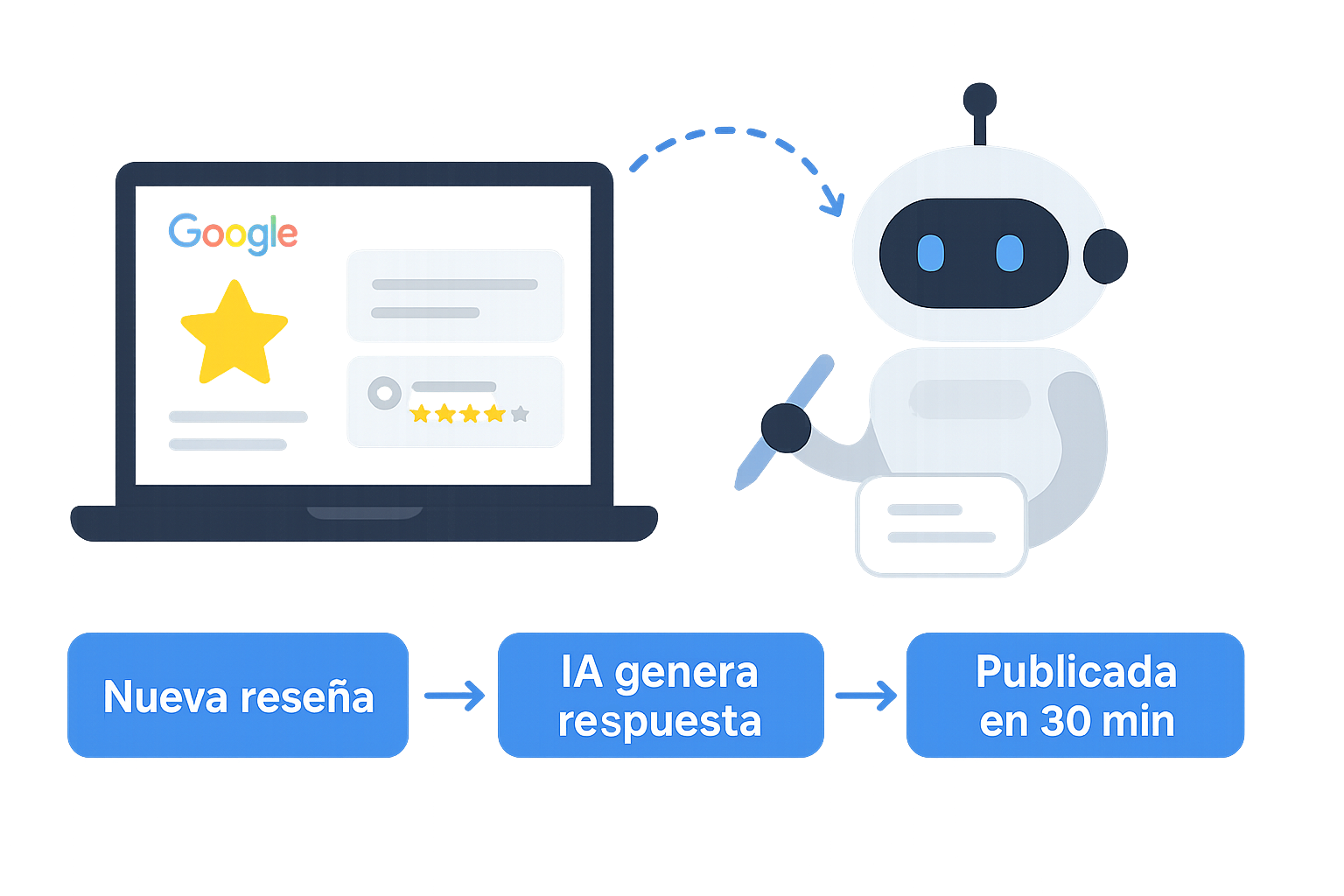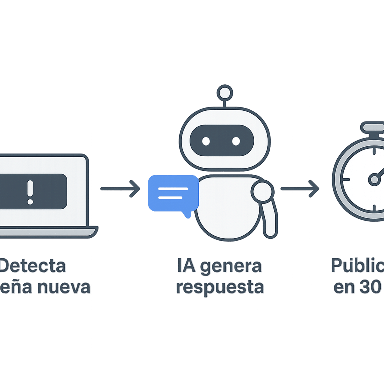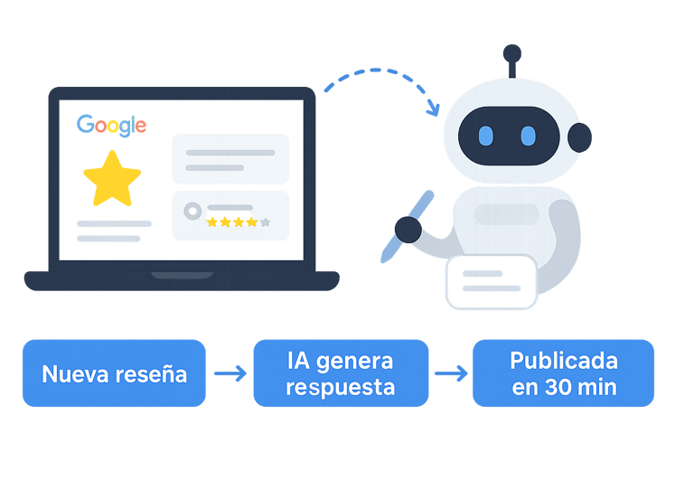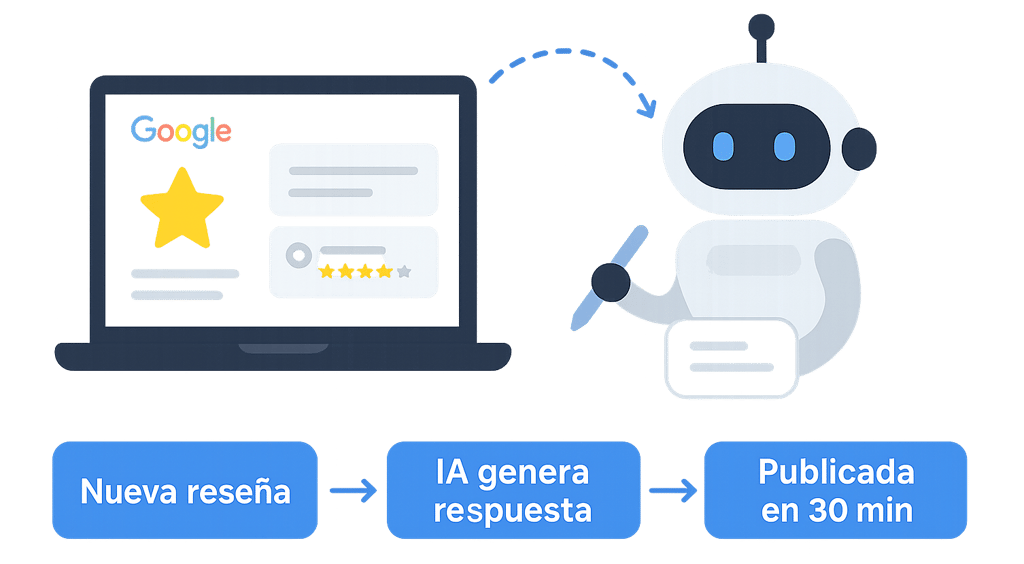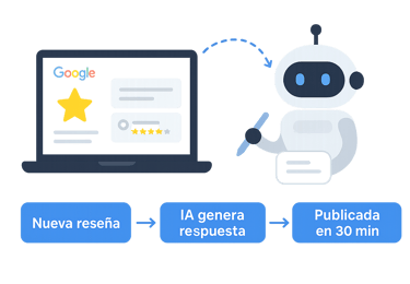 Sí. El sistema detecta la reseña, genera una respuesta profesional con IA y la publica automáticamente después de 30 minutos. No necesitas revisarlas ni intervenir manualmente.
